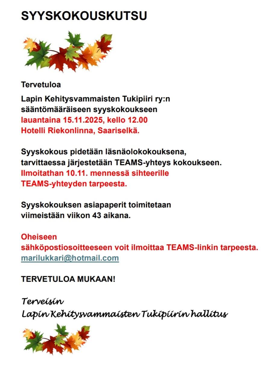 Lapin Kehitysvammaisten Tukipiirin pikkujoulut ja syyskokous